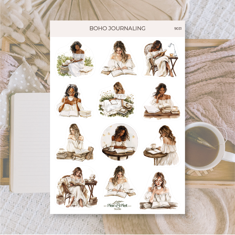 Dette ark hylder de stille stunder med dagbog, bøger og refleksion. Klistermærkerne viser smukke kvinder i boho-stil, fordybet i journaling, læsning og kreative pauser.